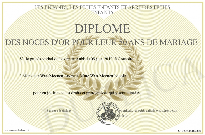 Envoyez par email votre DIPLOME DES NOCES D'OR POUR LEUR 50 ANS DE MARIAGE personalisé
