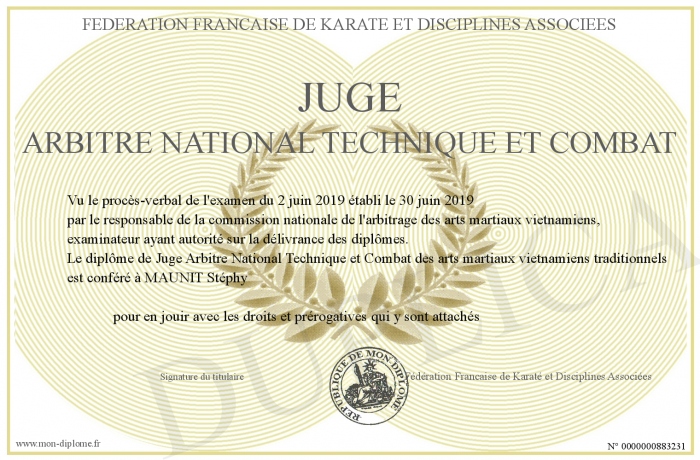 Envoyez par email votre Juge Arbitre National Technique et Combat personalisé