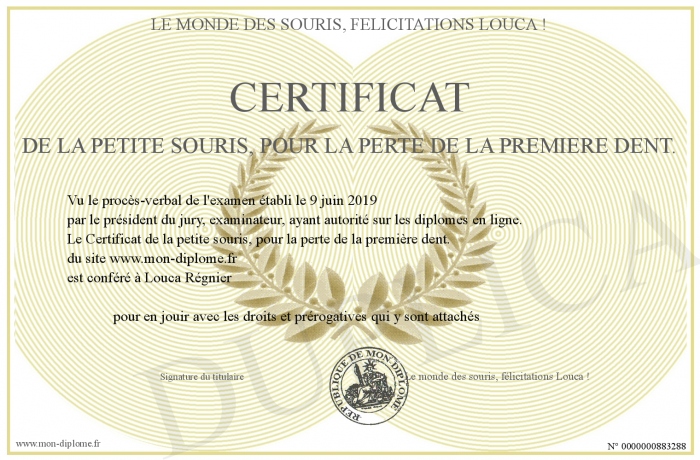 Envoyez par email votre Certificat de la petite souris, pour la perte de la première dent. personalisé