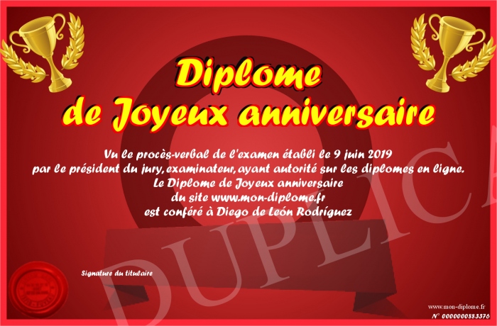Envoyez par email votre Diplôme de Joyeux anniversaire personalisé