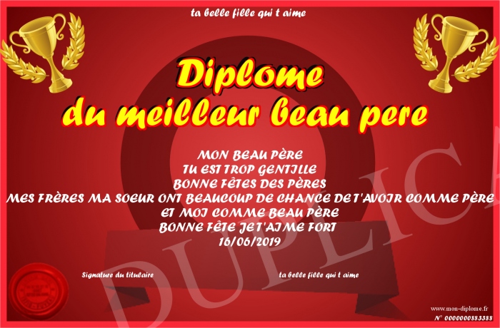 Envoyez par email votre Diplôme du meilleur beau pere personalisé