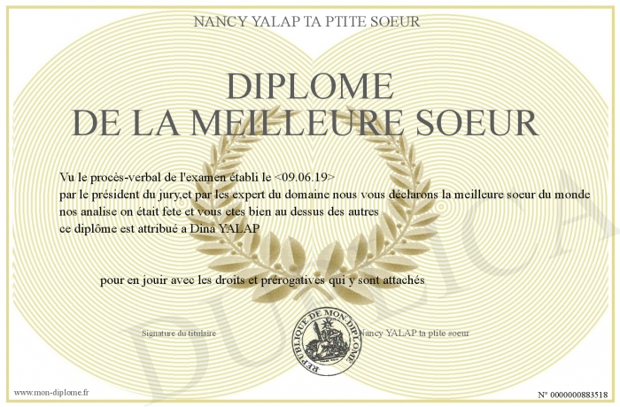 Envoyez par email votre Diplôme de la meilleure soeur personalisé