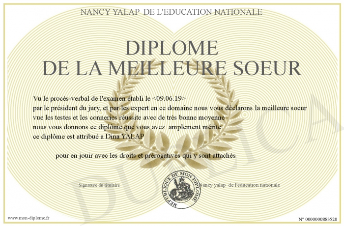 Envoyez par email votre Diplôme de la meilleure soeur personalisé