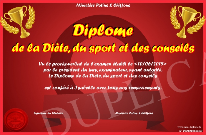 Envoyez par email votre Diplôme de la Diète, du sport et des conseils personalisé