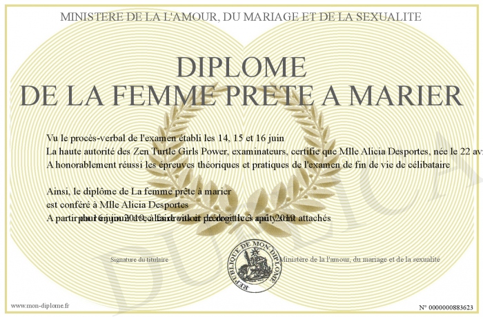 Envoyez par email votre Diplôme de la femme prete a marier personalisé