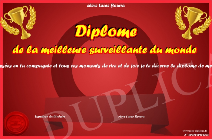 Envoyez par email votre Diplôme de la meilleure surveillante du monde personalisé