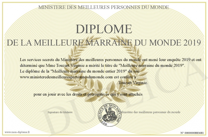 Envoyez par email votre Diplôme de la meilleure marraine du monde 2019 personalisé