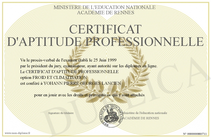 Envoyez par email votre CERTIFICAT D'APTITUDE PROFESSIONNELLE personalisé