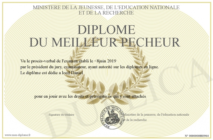 Envoyez par email votre Diplôme du meilleur pécheur personalisé