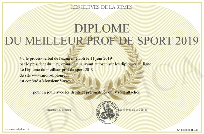 Envoyez par email votre Diplôme du meilleur prof de sport 2019 personalisé