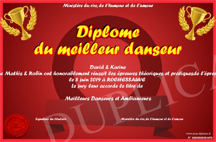 Envoyez par email votre Diplome du meilleur danseur personalisé
