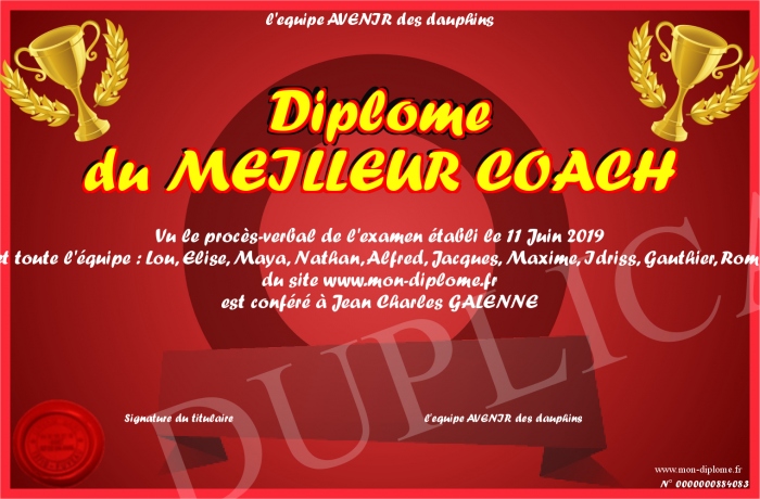Envoyez par email votre Diplôme du MEILLEUR COACH personalisé