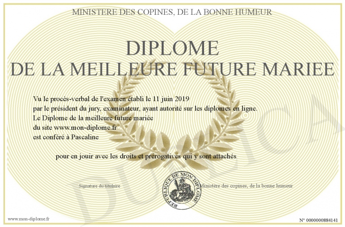 Envoyez par email votre Diplôme de la meilleure future mariée personalisé