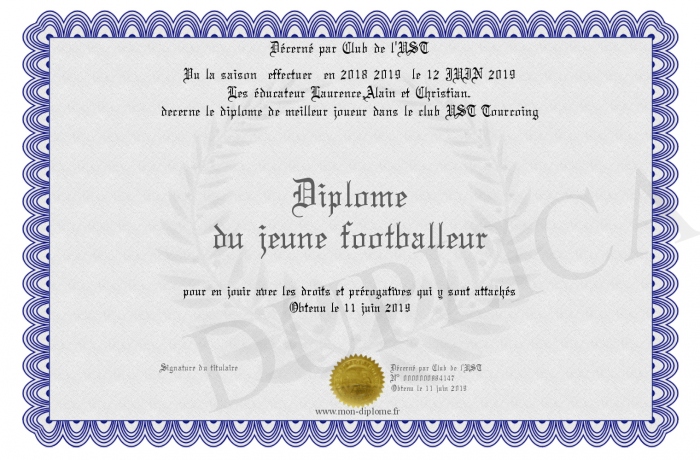 Envoyez par email votre Diplome du jeune footballeur personalisé