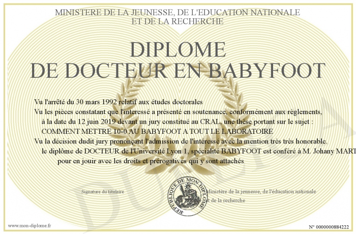 Envoyez par email votre Diplôme de docteur en Babyfoot personalisé