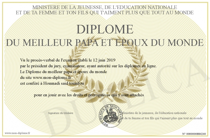 Envoyez par email votre Diplôme du meilleur papa et époux du monde personalisé