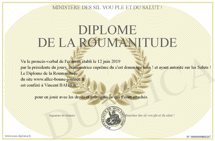 Envoyez par email votre Diplôme de la Roumanitude personalisé