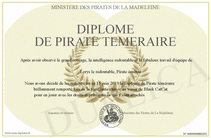 Envoyez par email votre Diplôme de Pirate téméraire personalisé