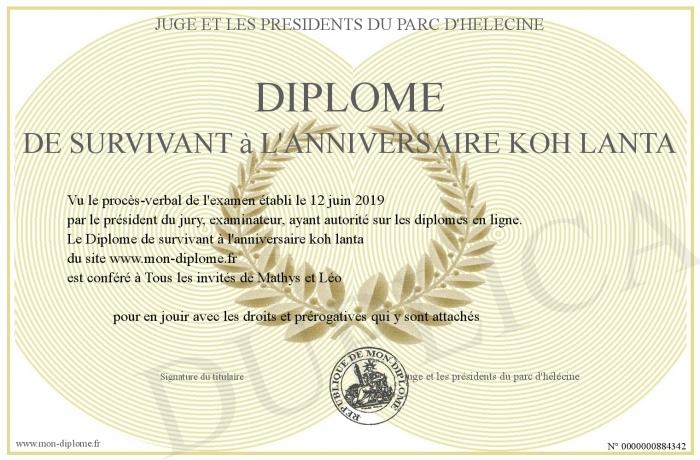 Envoyez par email votre Diplôme de survivant à l'anniversaire koh lanta personalisé