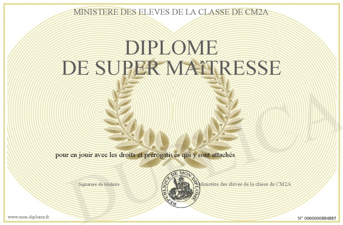 Envoyez par email votre Diplôme de Super Maîtresse personalisé