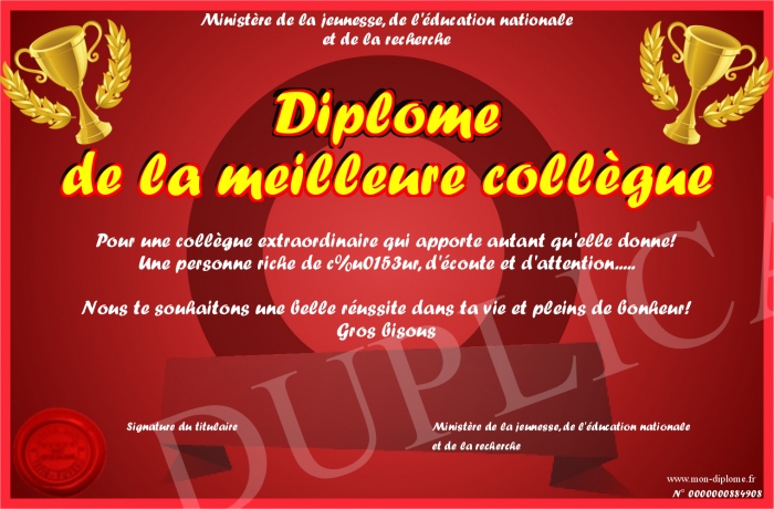 Envoyez par email votre Diplome de la meilleure collègue personalisé