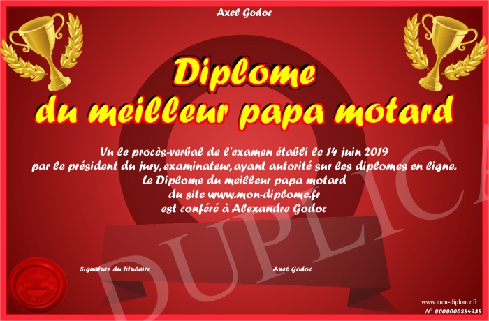 Envoyez par email votre Diplôme du meilleur papa motard personalisé