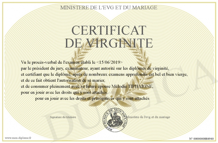 Envoyez par email votre CERTIFICAT DE VIRGINITE personalisé