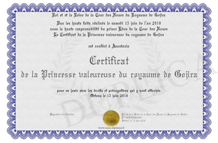 Envoyez par email votre Certificat de la Princesse valeureuse du royaume de Gojira personalisé