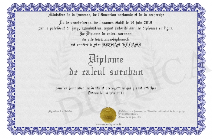 Envoyez par email votre Diplôme de calcul soroban personalisé