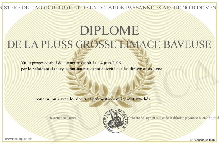 Envoyez par email votre Diplôme de la pluss grosse limace baveuse personalisé