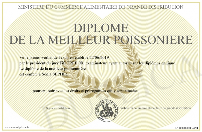 Envoyez par email votre Diplôme de la meilleur poissonière personalisé