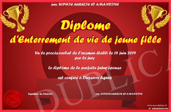 Envoyez par email votre Diplome d'Enterrement de vie de jeune fille personalisé