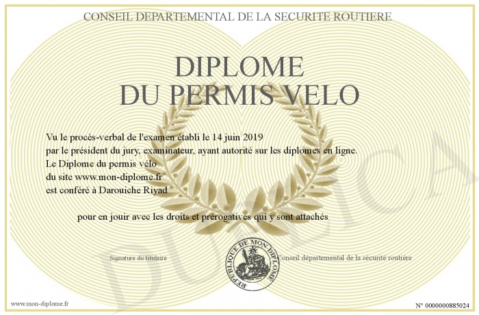 Envoyez par email votre Diplôme du permis vélo personalisé