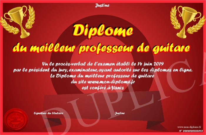 Envoyez par email votre Diplôme du meilleur professeur de guitare personalisé