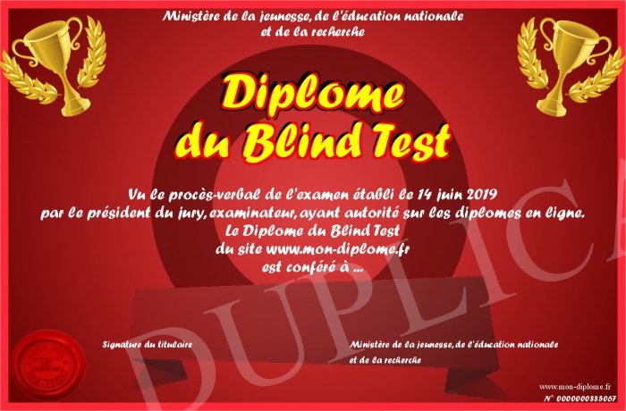 Envoyez par email votre Diplôme du Blind Test personalisé