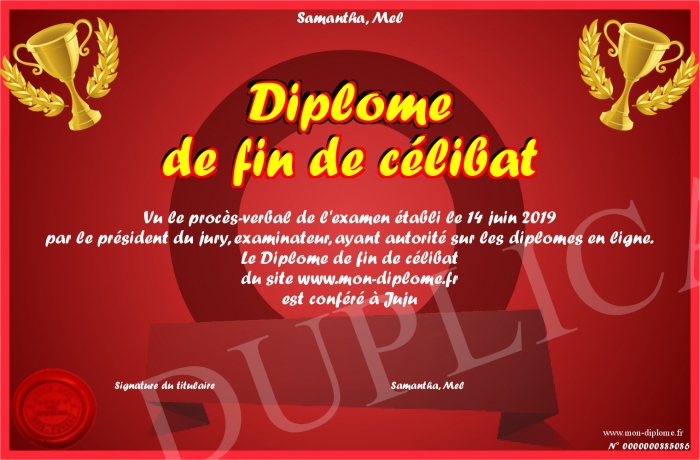 Envoyez par email votre Diplôme de fin de célibat personalisé