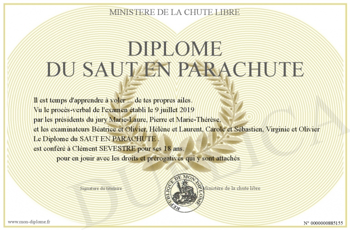 Envoyez par email votre Diplôme du SAUT EN PARACHUTE personalisé