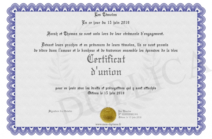 Envoyez par email votre Certificat d'union personalisé