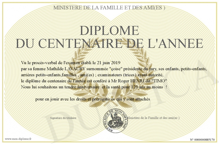 Envoyez par email votre Diplôme du CENTENAIRE DE L'ANNEE personalisé