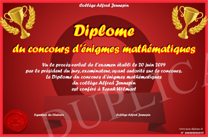 Envoyez par email votre Diplôme du concours d'énigmes mathématiques personalisé