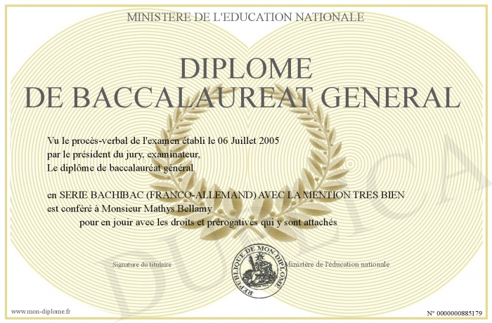 Envoyez par email votre Diplôme de baccalauréat général personalisé