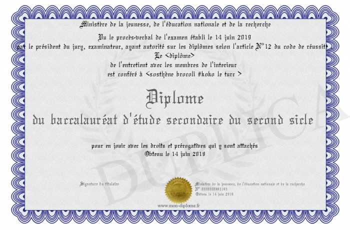 Envoyez par email votre Diplôme du baccalauréat d'étude secondaire du second sicle personalisé