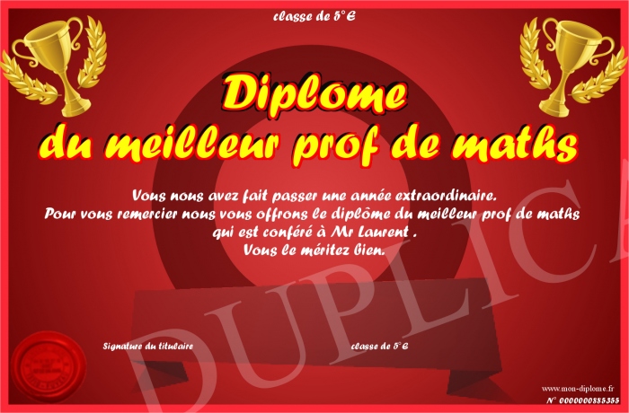 Envoyez par email votre Diplôme du meilleur prof de maths personalisé