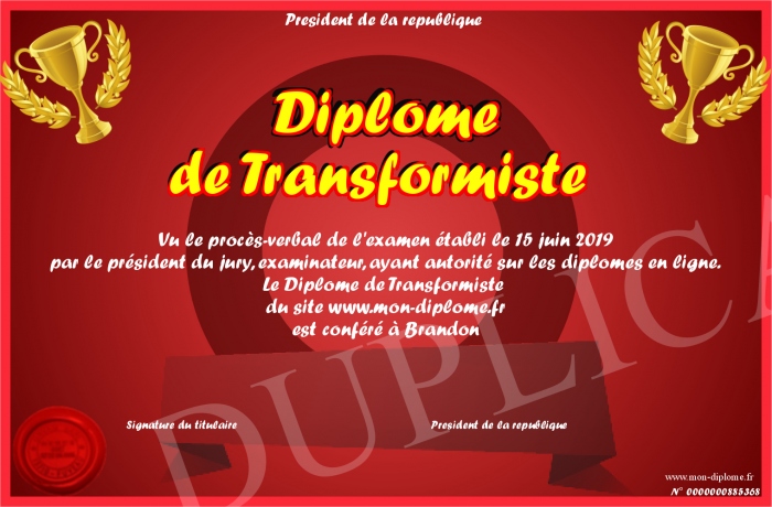 Envoyez par email votre Diplôme de Transformiste personalisé