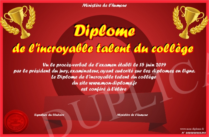 Envoyez par email votre Diplôme de l'incroyable talent du collège personalisé