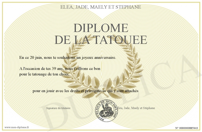 Envoyez par email votre Diplôme de la tatouée personalisé