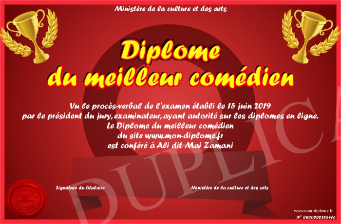 Envoyez par email votre Diplôme du meilleur comédien personalisé