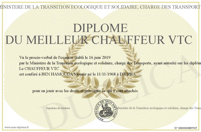 Envoyez par email votre Diplôme du meilleur CHAUFFEUR VTC personalisé