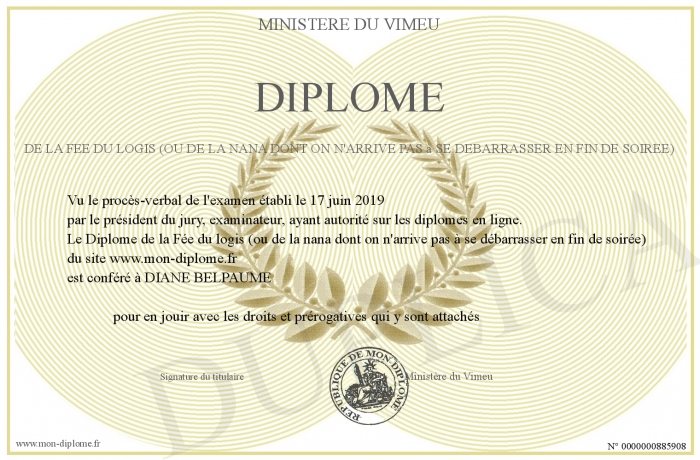 Envoyez par email votre Diplôme de la Fée du logis (ou de la nana dont on n'arrive pas à se débarrasser en fin de soirée) personalisé