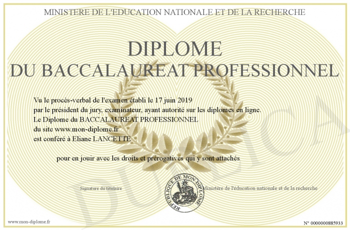 Envoyez par email votre Diplôme du BACCALAUREAT PROFESSIONNEL personalisé